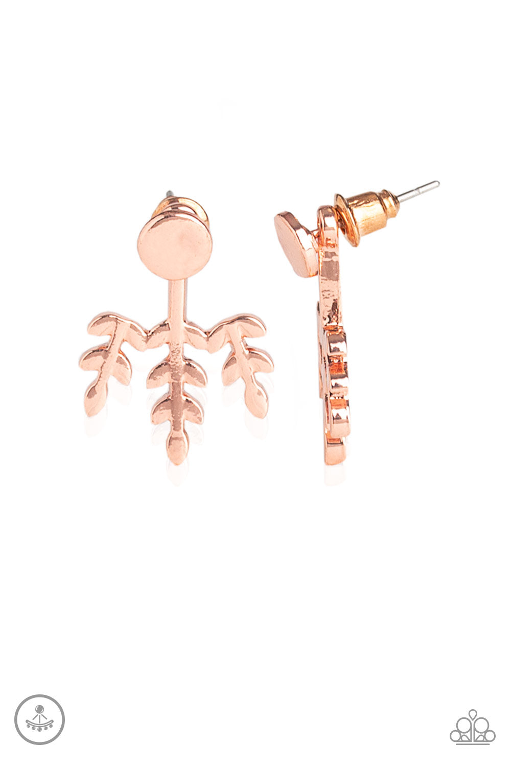 A flat shiny copper stud attaches to a double-sided post, designed to fasten behind the ear. Brushed in a high-sheen shimmer, the leafy double-sided post peeks out beneath the ear for a seasonal look. Earring attaches to a standard post fitting.