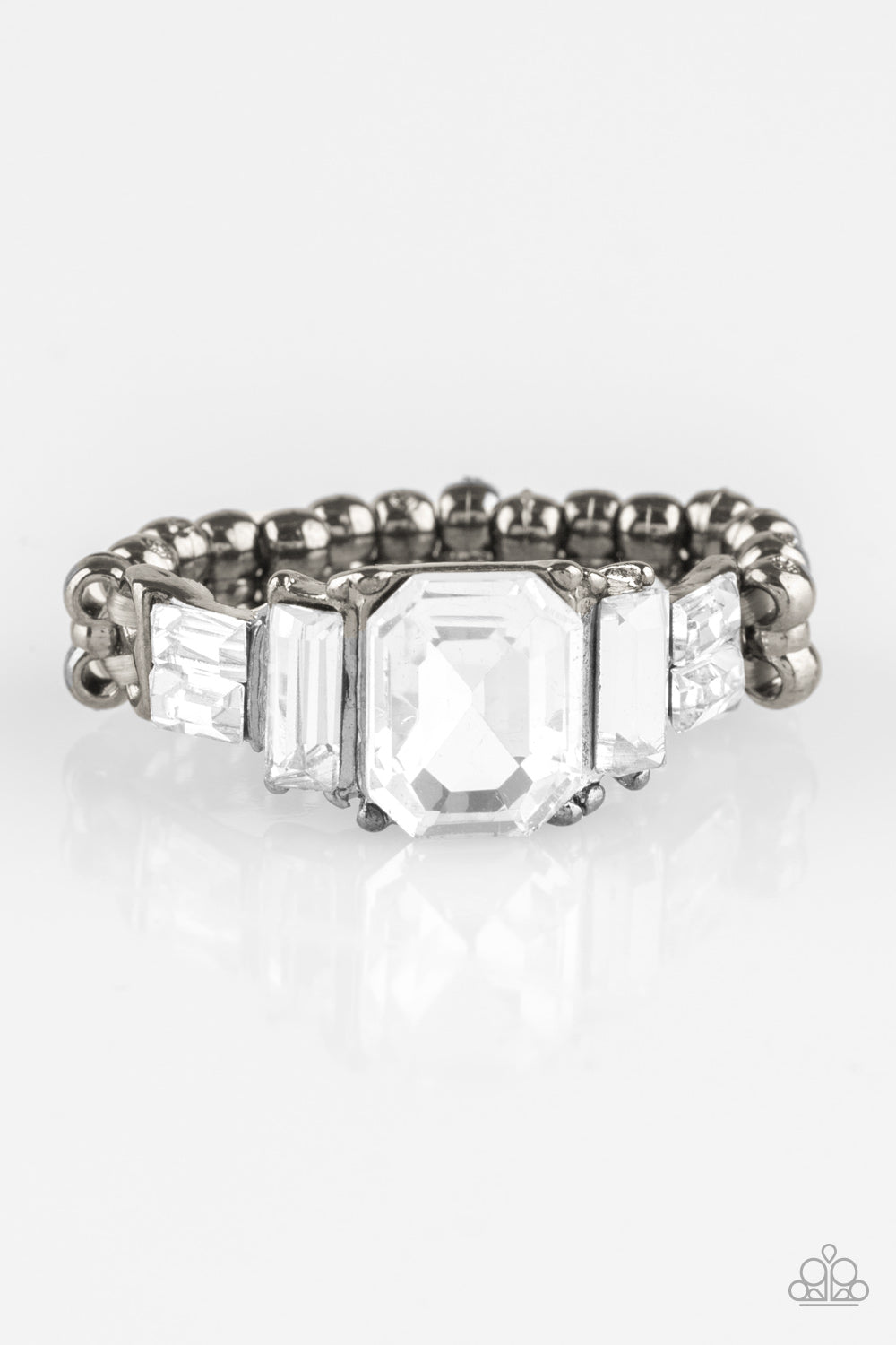 Varying in cut and shimmer, glittery rhinestones stack into a glamorous band across the finger. Features a dainty stretchy band for a flexible fit.