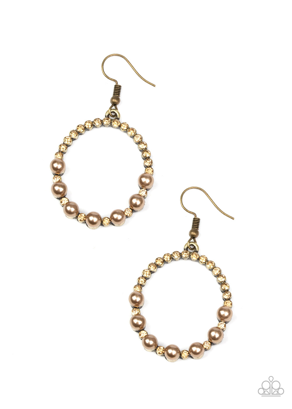 Encrusted in golden topaz rhinestones, the bottom of a glistening brass hoop is dotted in pearly brass beads for a refined fashion. Earring attaches to a standard fishhook fitting.