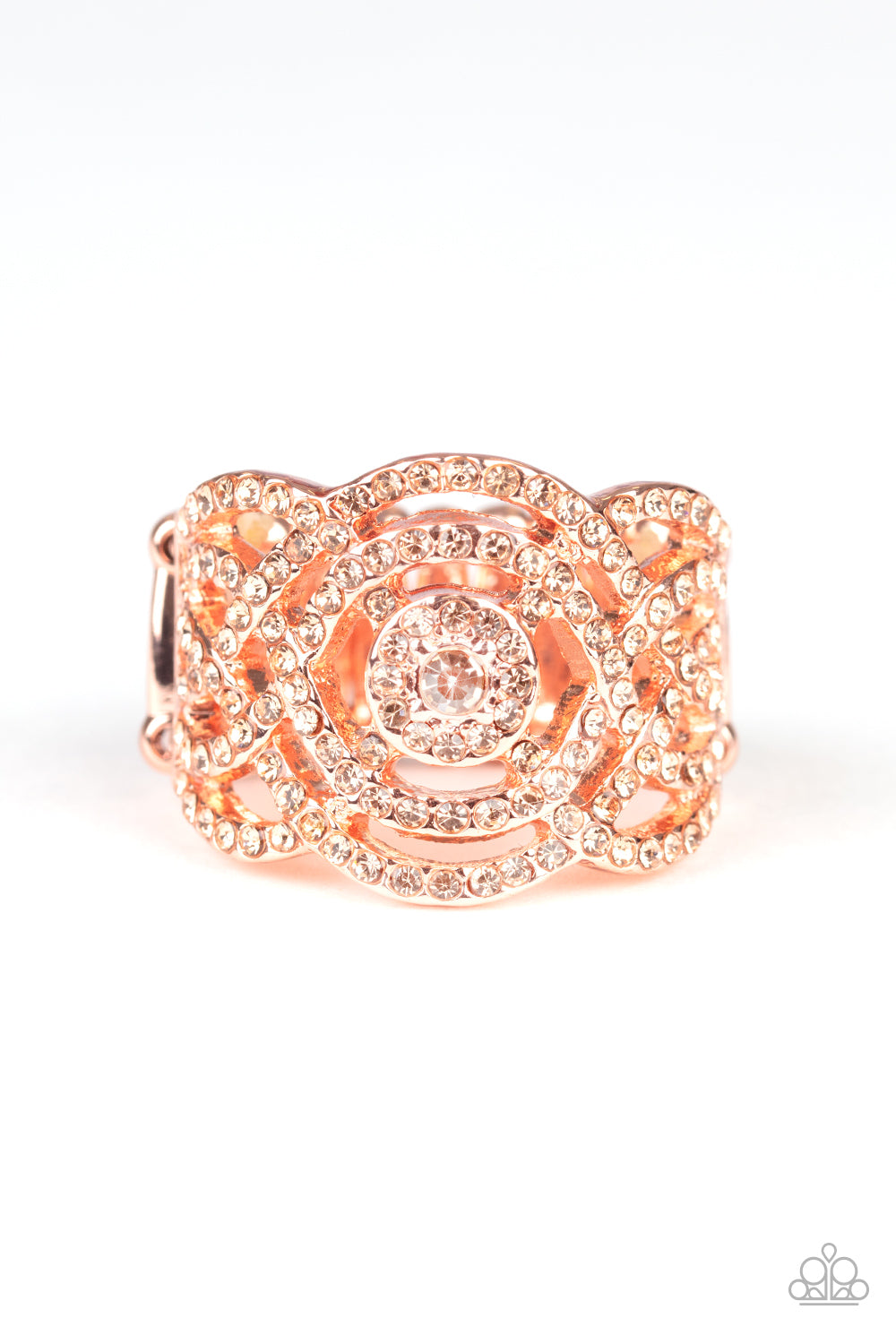 Dotted in dainty peach rhinestones, dainty shiny copper bands swirl and whirl across the finger, coalescing into a refined frame. Features a stretchy band for a flexible fit.