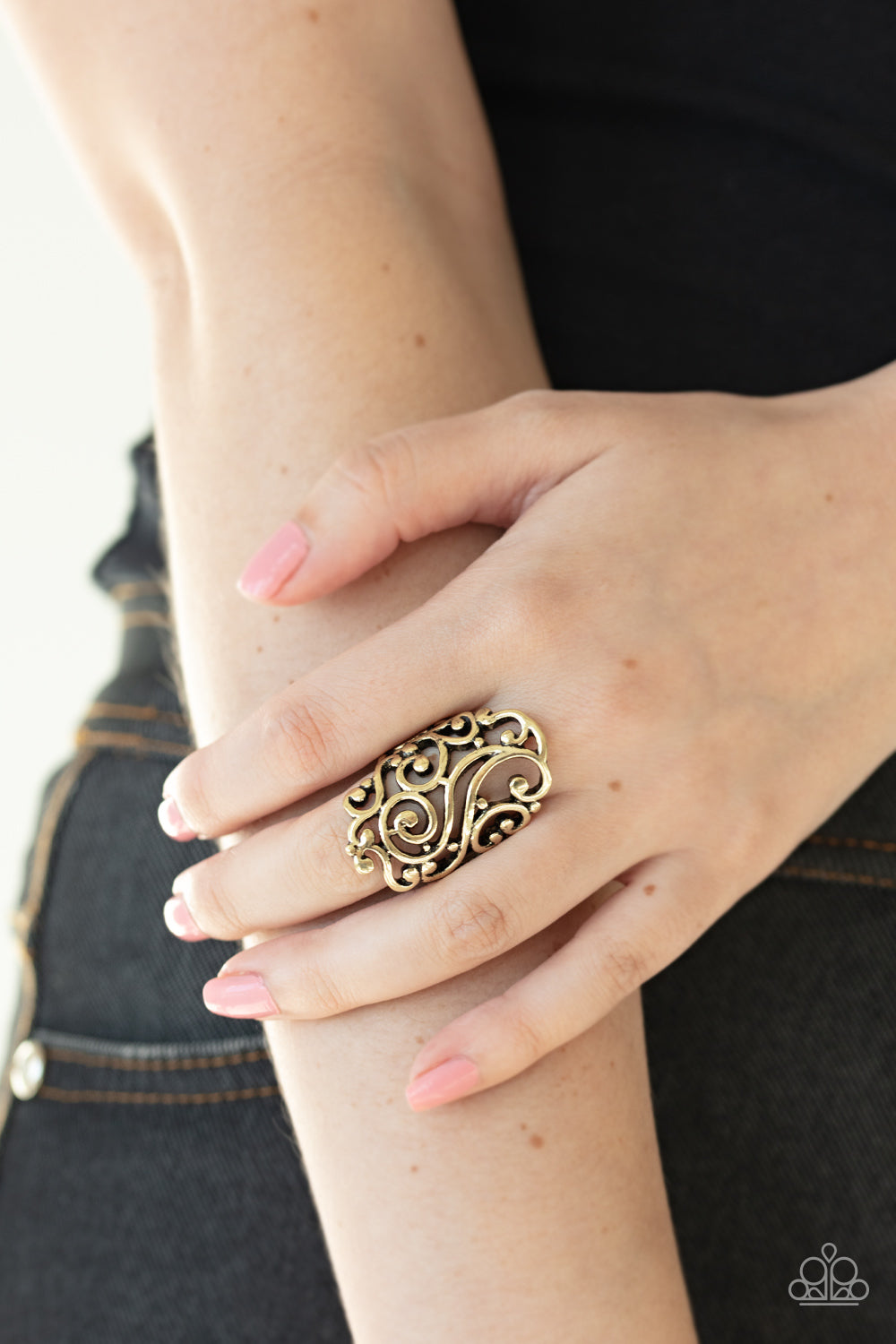 Antiqued brass vine-like filigree climbs the finger, coalescing into a seasonal frame. Features a stretchy band for a flexible fit.
