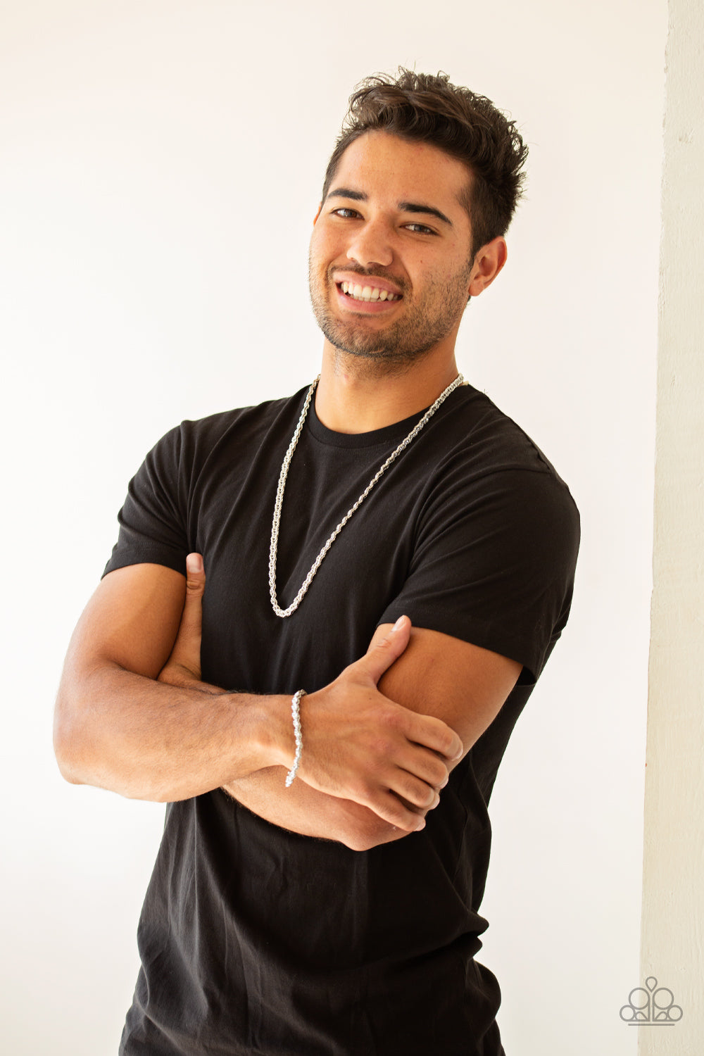 Brushed in a high-sheen finish, an ornate silver chain drapes across the chest for a bold look. Features an adjustable clasp closure.